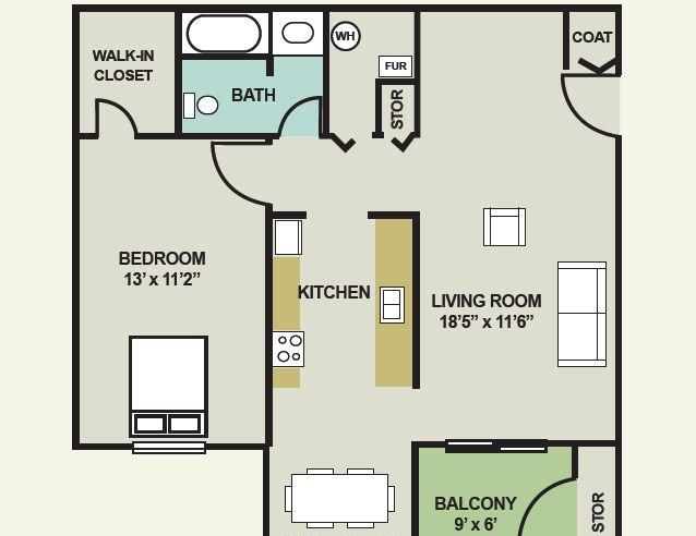 1 bed, 1 bath, 278 sqft